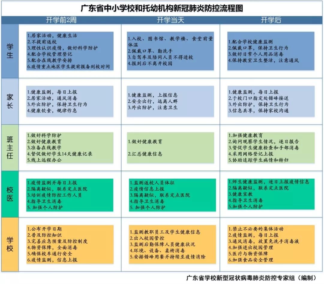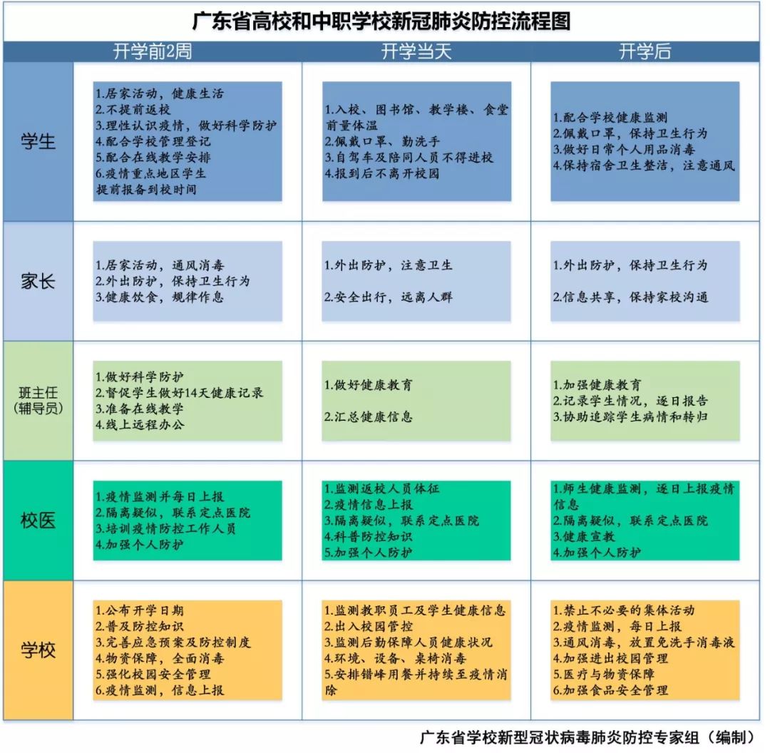 广东省要求全省教育系统要全员、全过程、全方位周密防控,管事、管人、管场所、管过程、管应急,狠抓落实,确保开学安全。疫情防控每项工作、每个层面、每个环节,任务明确,工作对象明确,标准、规范、程序明确,责任明确。无死角、无遗漏、无盲区,全员、全过程、全方位织密疫情防控网。校园实行封闭式管理,校内实行网格化管理。把好校门第一关,严防疫情输入校园。制定各类学校新冠肺炎防控流程图,完善应急预案并进行演练。