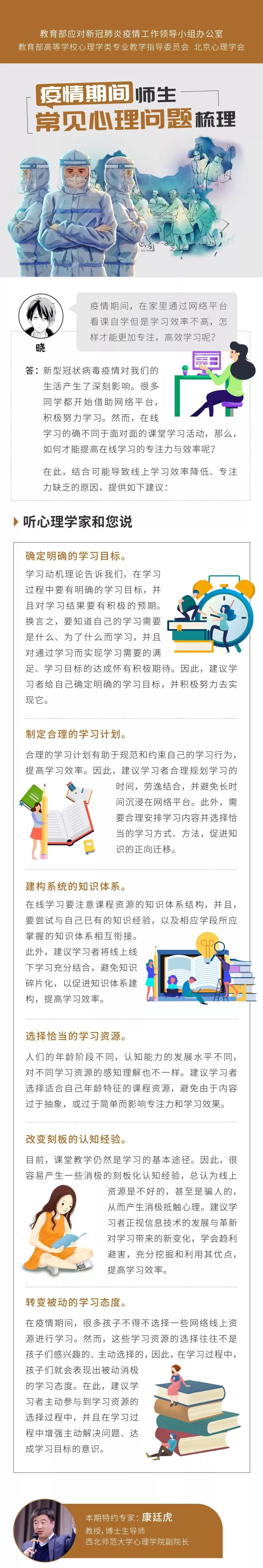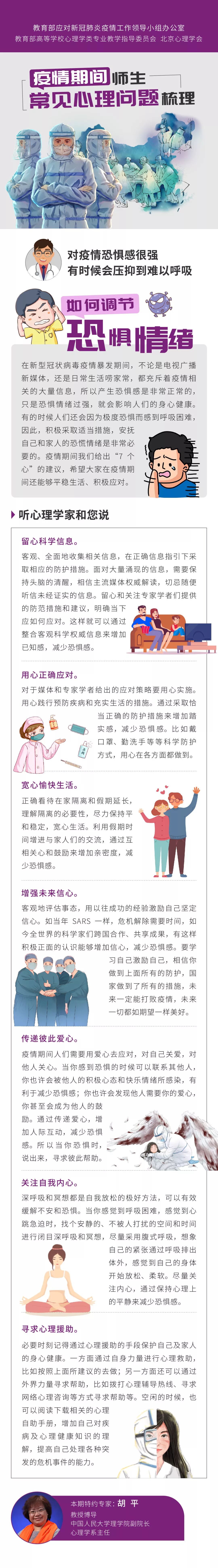 今天,微言教育推出《用“心”战“疫”》第⑩期,随教育小微一起来听教育部高等学校心理学类专业教学指导委员会特约专家,中国人民大学胡平教授、西北师范大学康廷虎教授详解,疫情期间师生常见心理问题如何调整↓↓↓