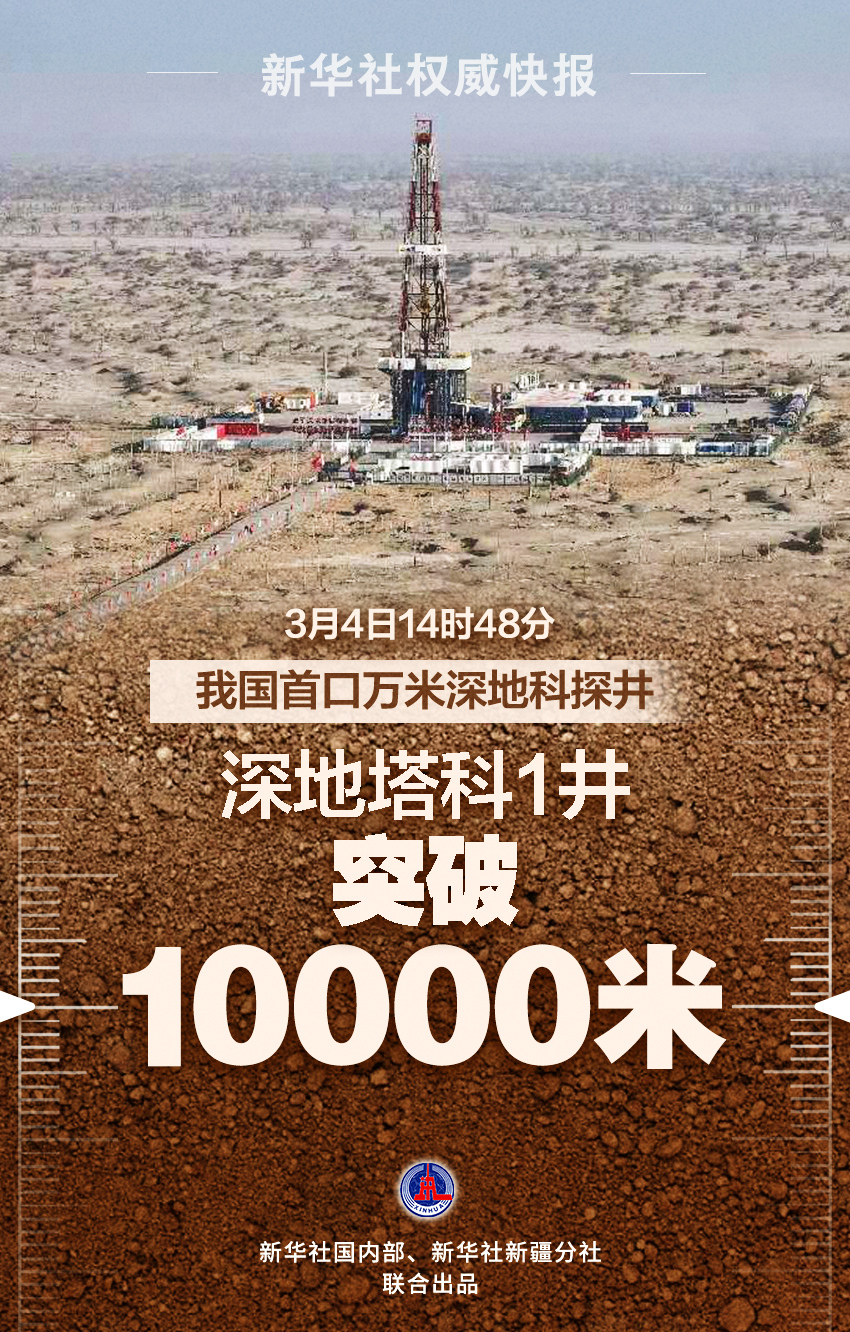 “9999.98,9999.99……”4日14时48分,随着一枚金刚石钻头持续刺破地下岩层,中国石油塔里木油田前方指挥部电子屏幕上的数字瞬间跃至“10000.00”,我国首口万米深地科探井正式穿越万米大关。这标志着继深空、深海探索大自然的壮举之后,我国在深地领域实现重大突破。