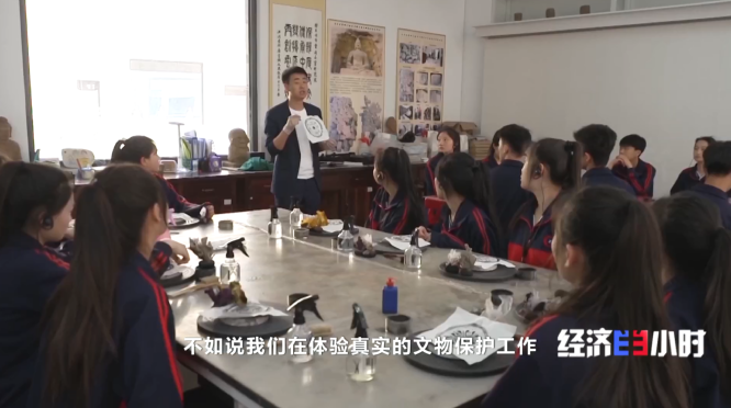 在云冈研究院文物保护中心,研学的年轻人走进文物修复工作现场,与文物修复师面对面交流,了解文物的传统修复手段。