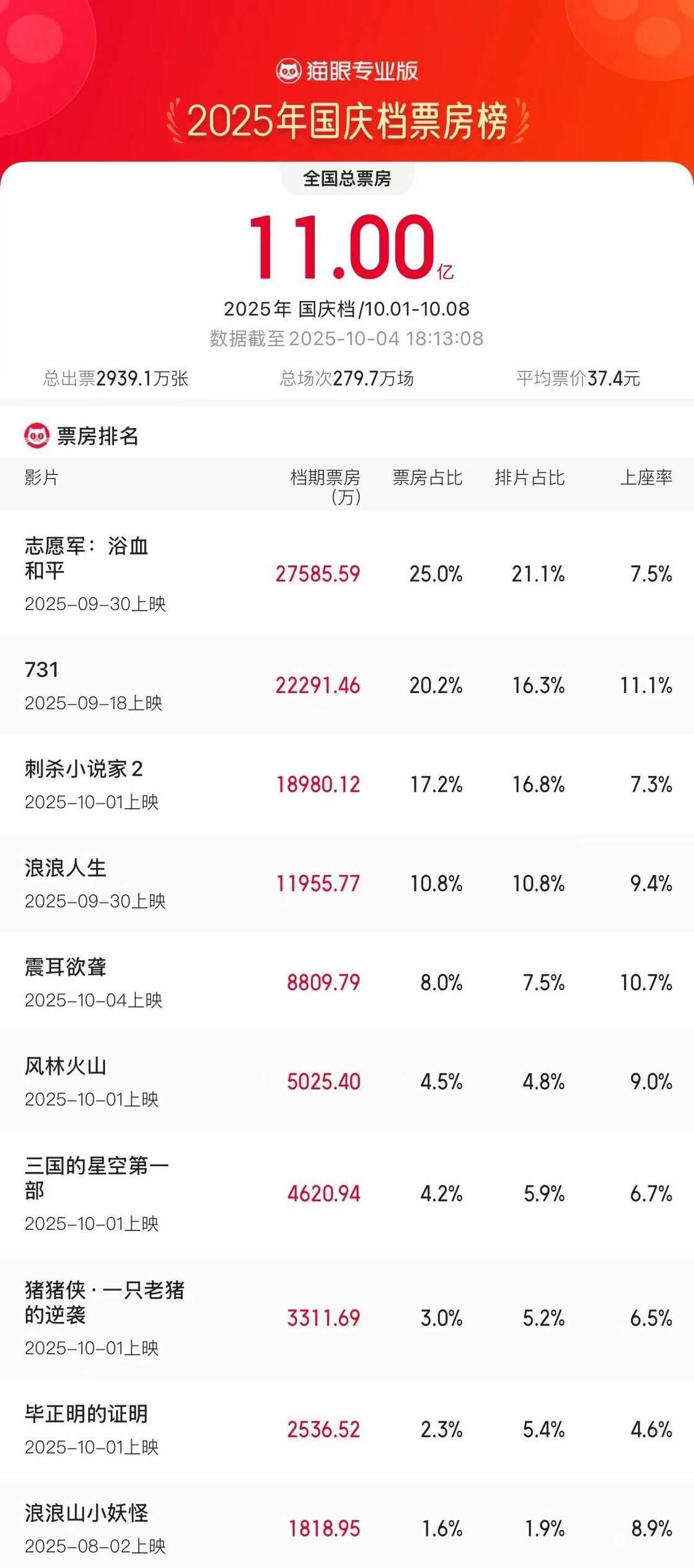 据猫眼专业版数据,截至10月4日18时13分,2025年国庆档档期票房破11亿,《志愿军:浴血和平》《731》《刺杀小说家2》分列前三位。