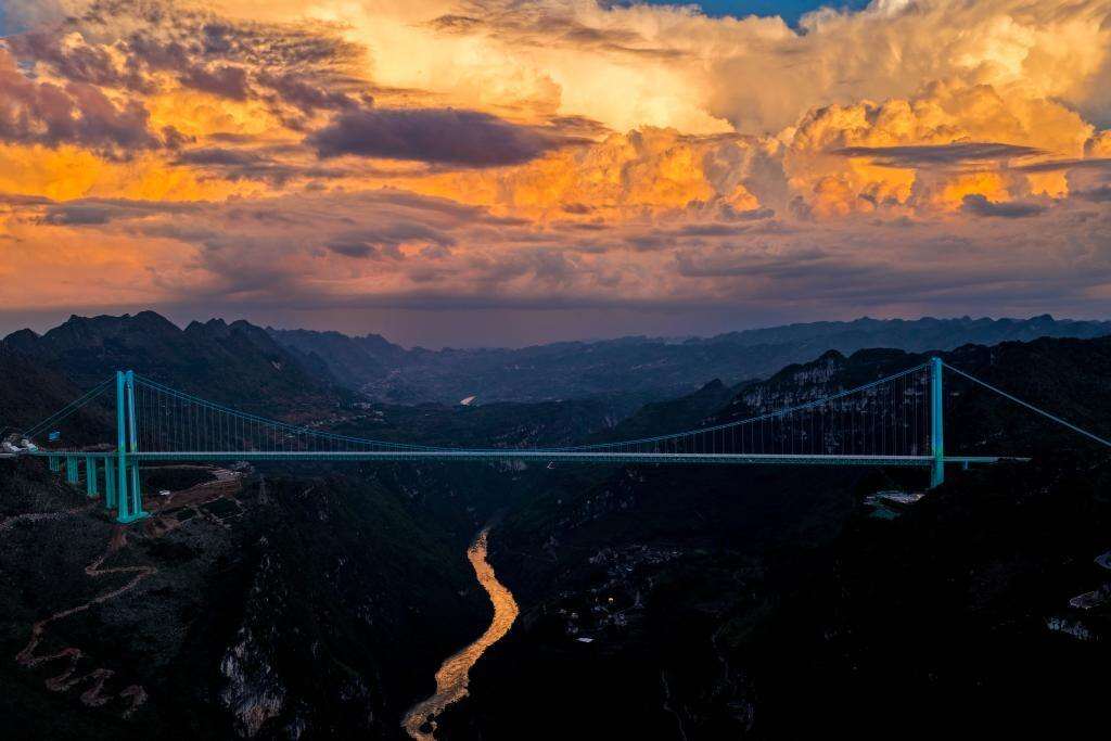 这是9月28日拍摄的夕阳下的贵州花江峡谷大桥(无人机照片)。新华社记者 杨文斌 摄