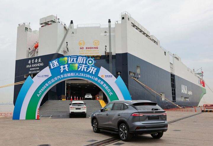 在上海海通国际汽车码头,一批上汽名爵品牌汽车停在“安吉安盛”轮旁准备装船(2025年5月15日摄)。