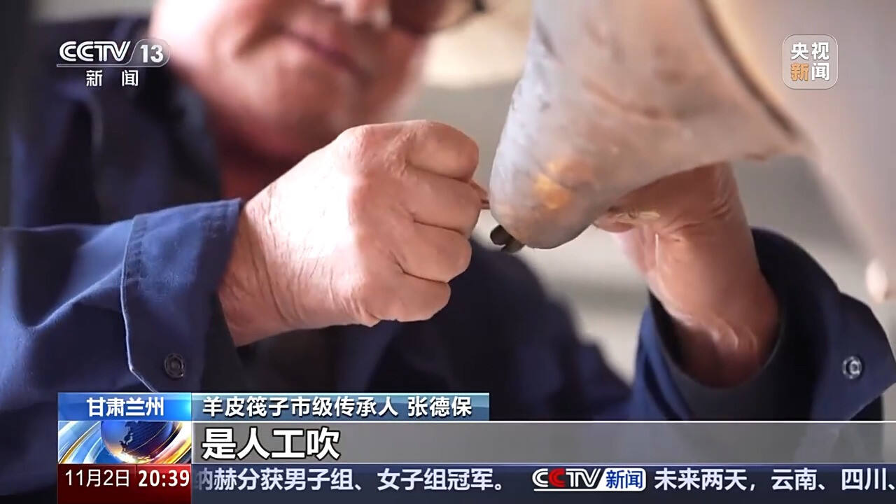 羊皮筏子市级传承人 张德保:吹到压不动就成了。是人工吹,人工吹的好处是啥,口里面有湿润的气。气管子吹干燥,对羊皮子不好。