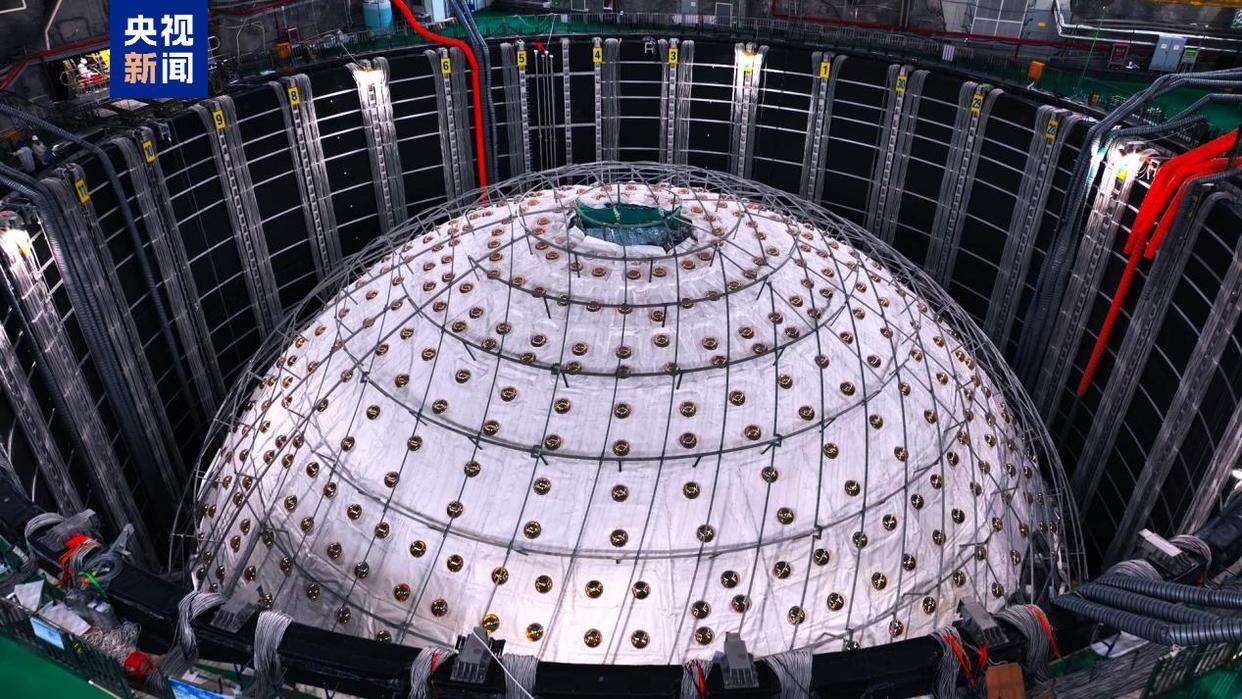 江门中微子实验由中国科学院高能物理研究所于2008年提出构想,2015年启动隧道和地下实验室建设。2021年12月完成实验室建设并开始了探测器在地下实验室的安装建设。江门中微子实验的核心探测器为有效质量达2万吨的液体闪烁体探测器,安置于地下实验大厅44米深的水池中央。直径41.1米的不锈钢网壳作为主支撑结构,承载了包括35.4米直径的有机玻璃球、两万吨液体闪烁体、两万只20英寸光电倍增管、两万五千只3英寸光电倍增管以及前端电子学、防磁线圈和隔光板等众多关键部件。遍布探测器内壁的光电倍增管协同工作,探测中微子与液闪相互作用产生的闪烁光,并将其转换为电信号输出。