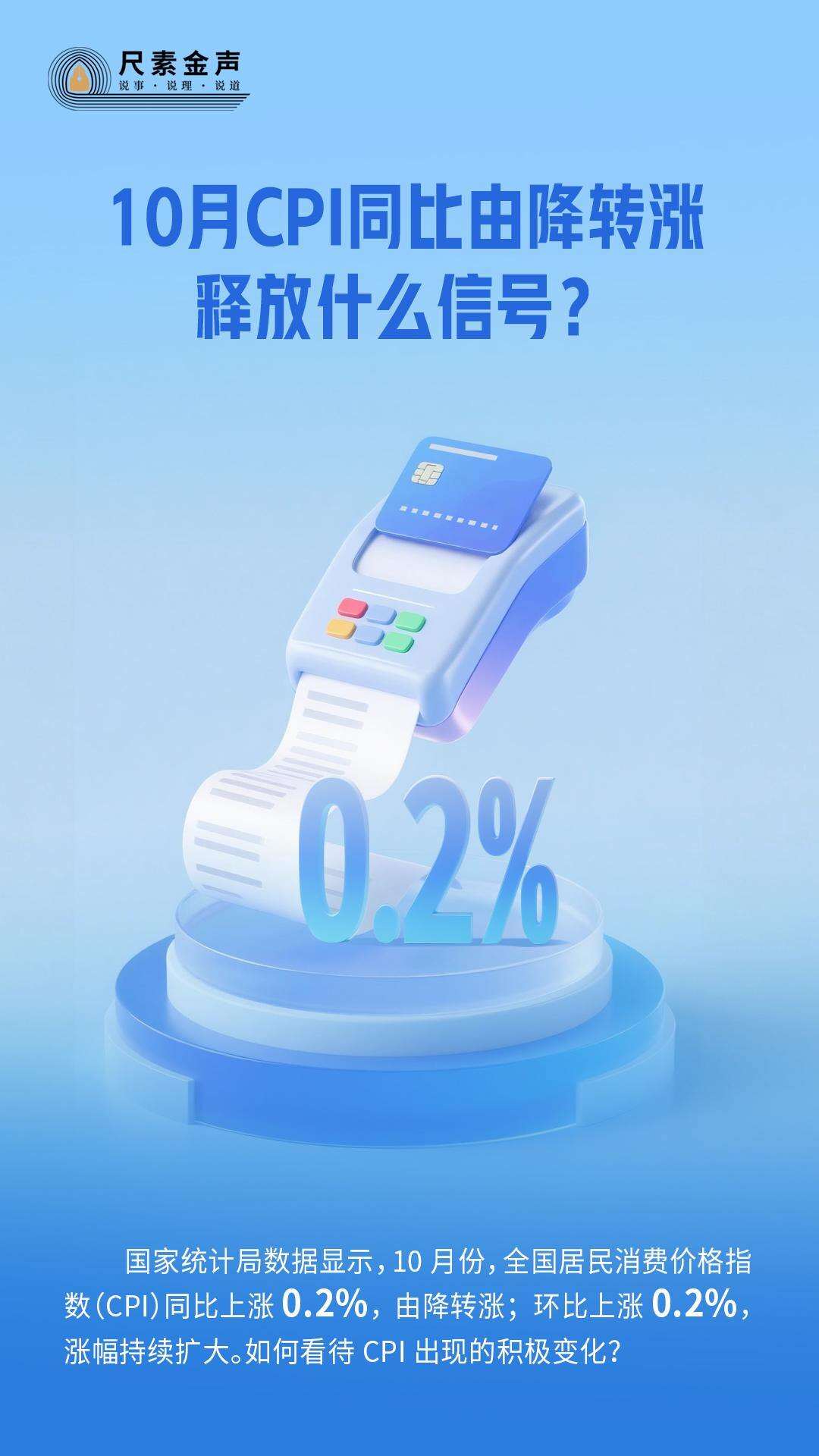 国家统计局数据显示,10月份,全国居民消费价格指数(CPI)同比上涨0.2%,由降转涨;环比上涨0.2%,涨幅持续扩大。如何看待CPI出现的积极变化?