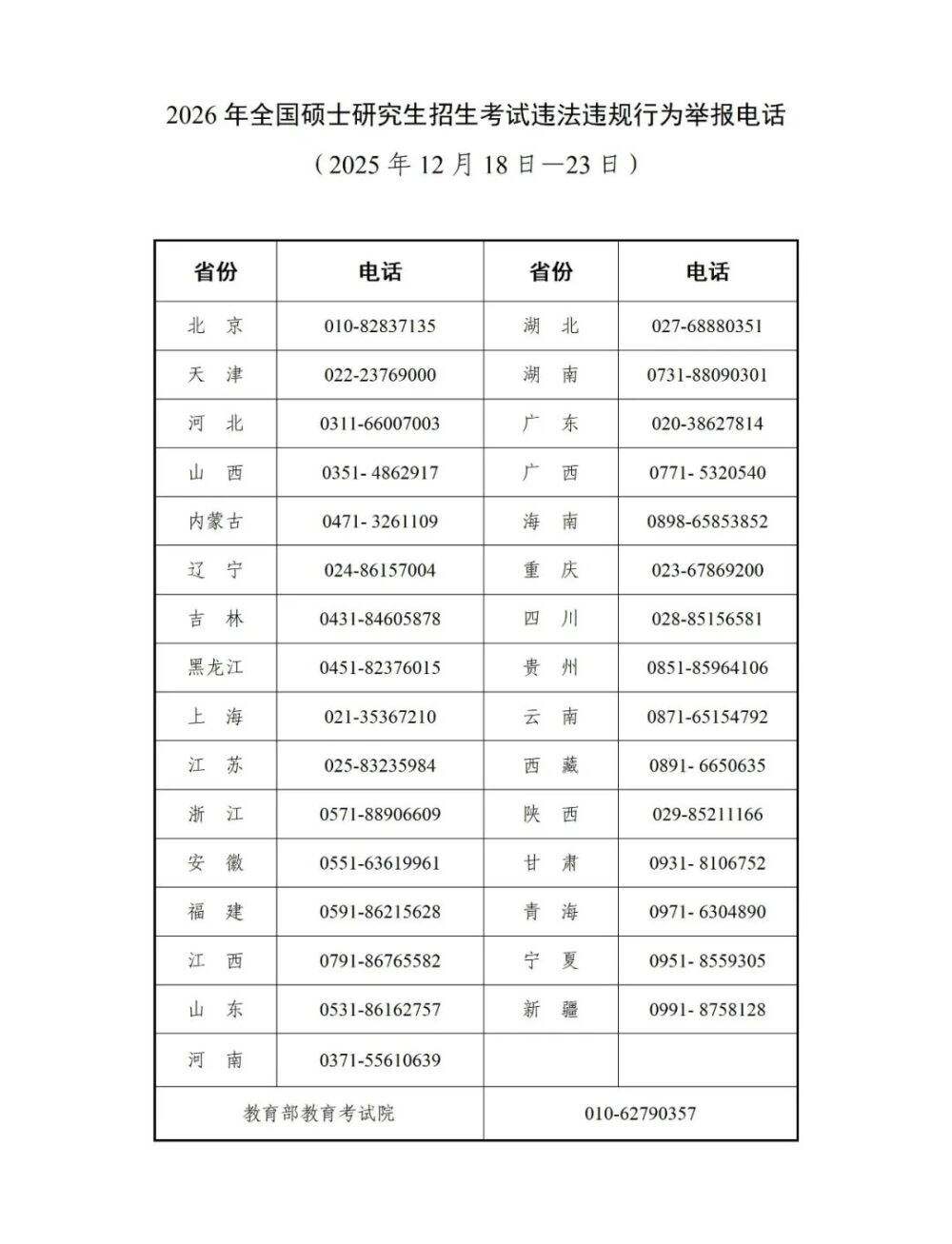 现向社会公布2026年全国硕士研究生招生考试违法违规行为举报电话,欢迎广大考生和公众参与监督。
