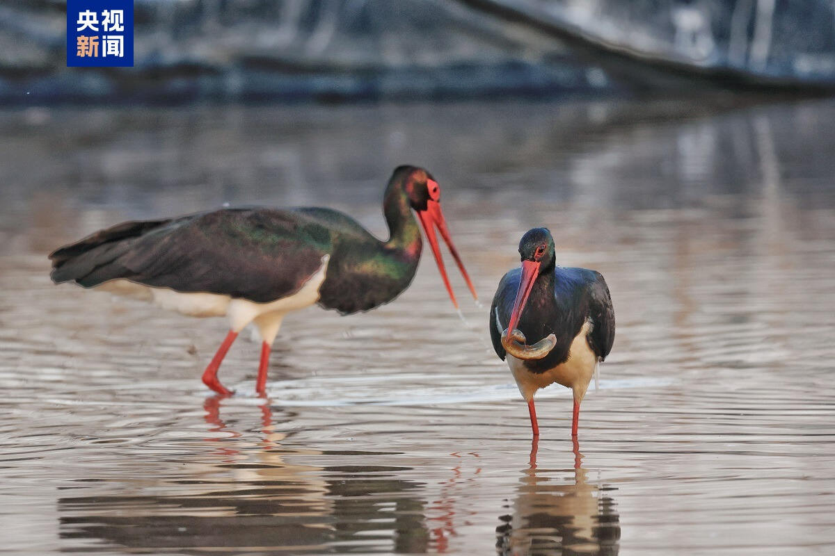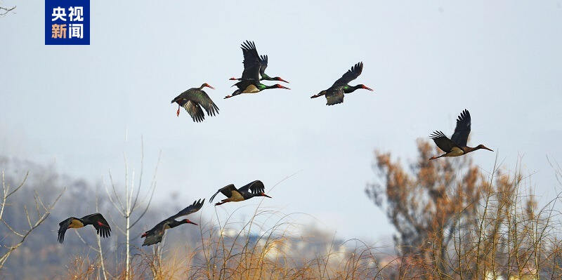 近日,在陕西西安长安区十里蛤蟆滩连片稻田里,一群红嘴红腿、身披黑羽的鸟儿正低头觅食,偶尔展翅盘旋,它们就是有“鸟类大熊猫”之称的国家一级保护野生动物——黑鹳