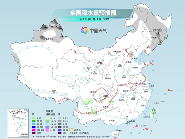 中央气象台预计,今天,新疆北部、内蒙古东部、黑龙江大部、吉林中东部、辽宁东北部等地部分地区有小雪,其中,新疆北疆北部和沿天山地区、黑龙江东南部、吉林东部等地部分地区有中到大雪,局地暴雪;四川南部、云南东部、台湾岛东部等地部分地区有小雨。