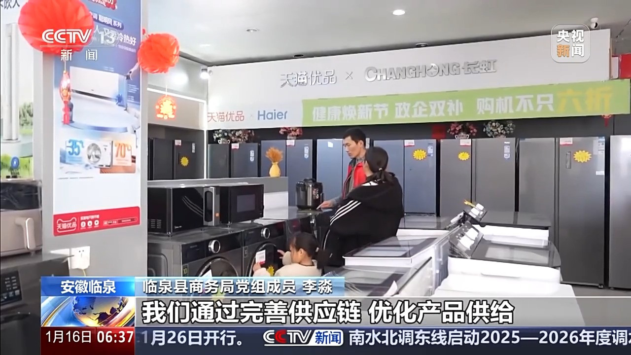 临泉县商务局党组成员 李淼:今年的节前消费呈现出明显品质化、智能化趋势,过去大家集中购买传统年货,现在各类智能化产品成为新选择。我们通过完善供应链,优化产品供给,让过去在一、二线城市流行的智能产品,能够快速适配并进入乡村家庭,激发了潜在的消费升级需求。