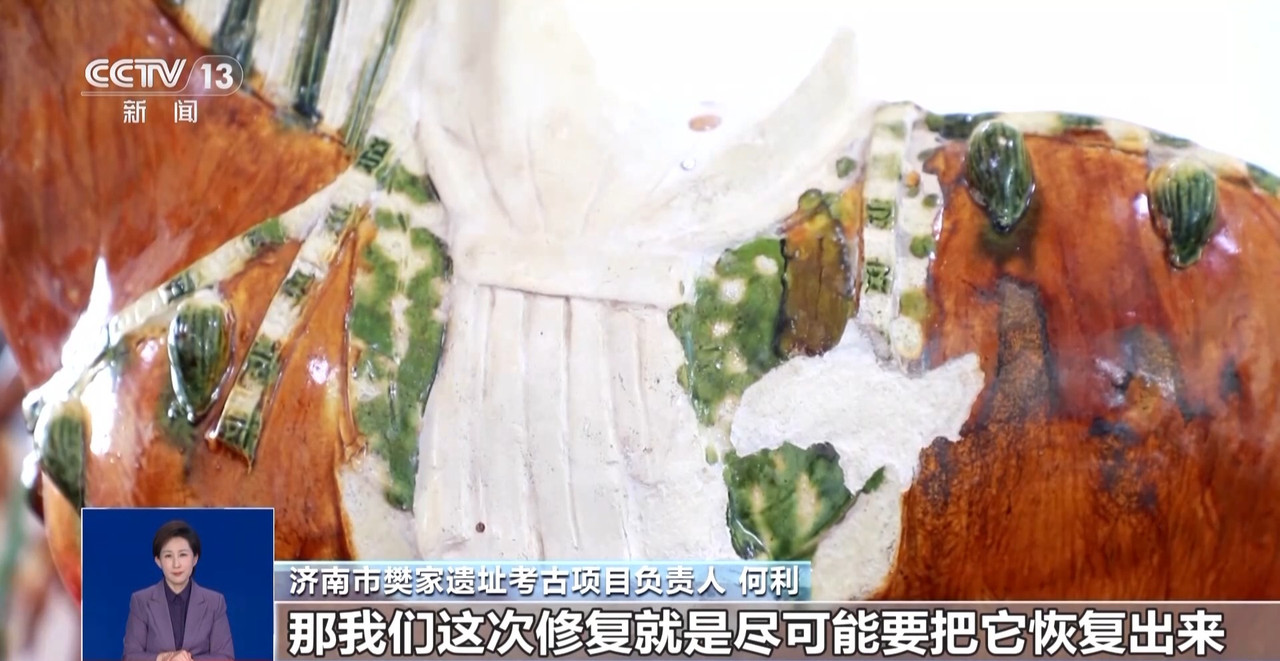 济南市樊家遗址考古项目负责人 何利:我们可以看出它很多三彩釉非常精细。因为在地下保存,它有很多的开片、脱落。我们这次修复就是尽可能地把它恢复。甚至小到几毫米的小碎屑,都要把它恢复到原位。修复以后还要对它加固,保证修复完以后,能长期保持稳定。