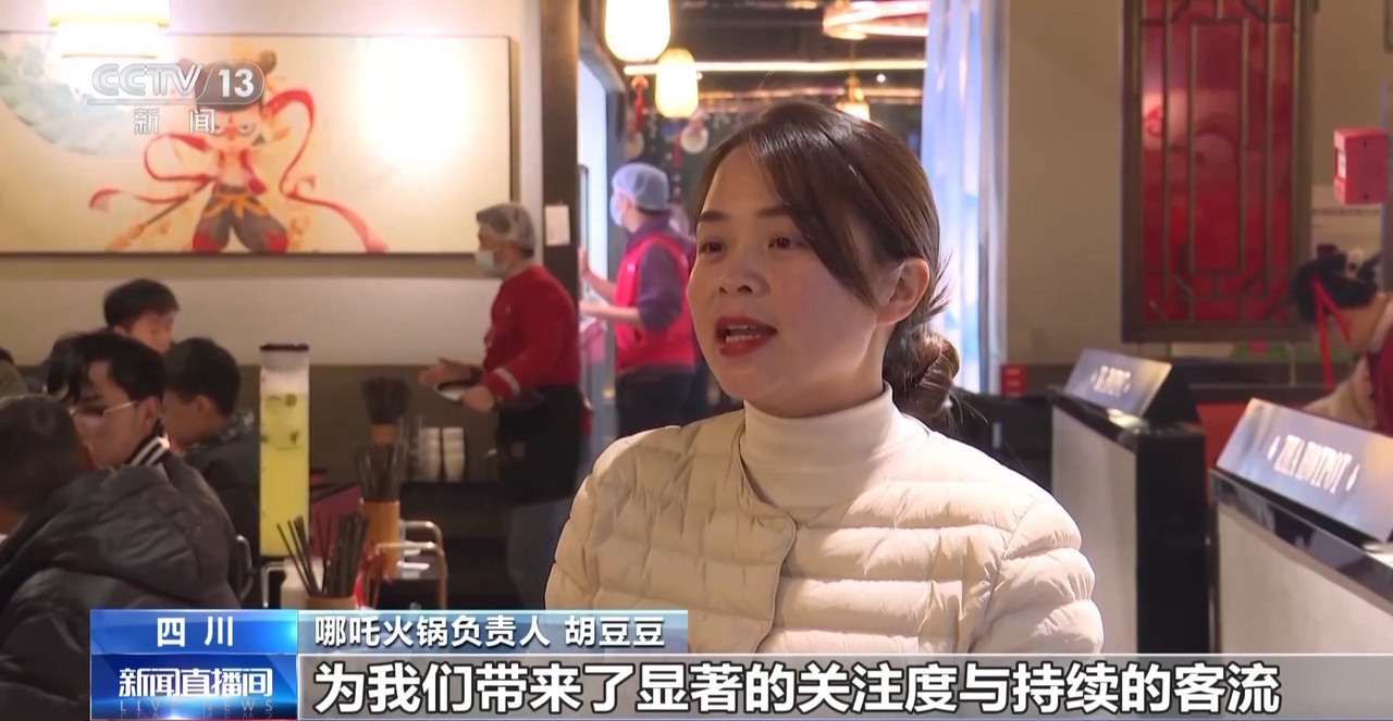 哪吒火锅负责人 胡豆豆:去年《哪吒2》电影的热映,为我们带来了显著的关注度与持续的客流,许多客人专程前来体验。为此,我们特别设计了哪吒主题的套餐,让顾客在品尝美食的同时,也能沉浸式感受哪吒文化的魅力。