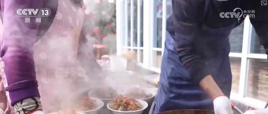 在南京溧水焦赞石村,村民们支起大锅,将糯米、红豆、红枣等食材进行熬煮,一碗碗滚烫的腊八粥免费分发给市民和游客。