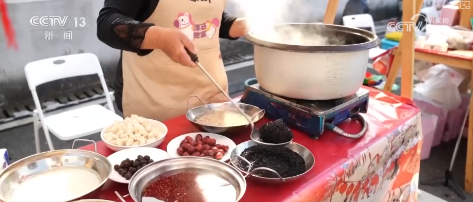 经过2个多小时的慢火熬煮,热气腾腾的腊八粥香漫街巷,当地村民和外地游客都可免费领取。