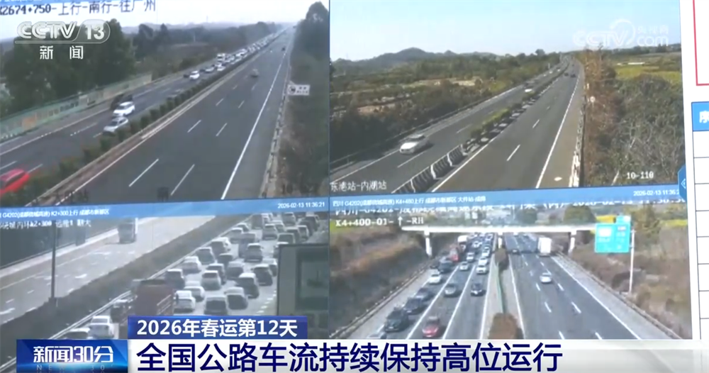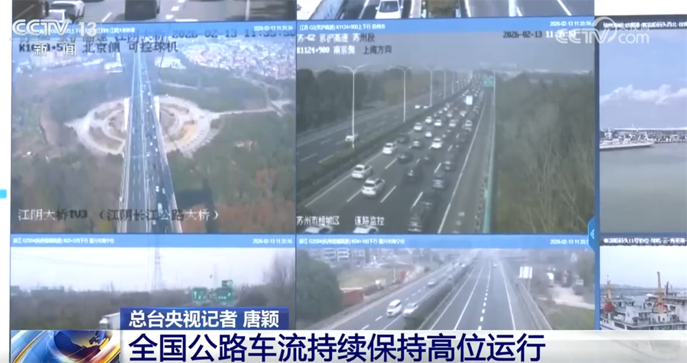 春运进入第12天,全国公路客流量持续增长。京沪高速江阴大桥上,目前从上海往无锡方向的车流偏多,旁边是京沪高速苏州段去往上海方向的画面,可以看到车流也比较集中。成都绕城高速,可以看到目前高速的车流量已经增多,路段出现了缓行的情况。