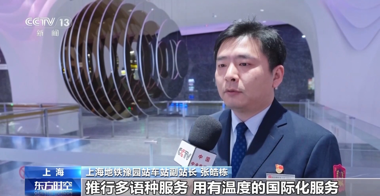 上海地铁豫园站车站副站长 张皓栋:在硬件上,站内部署的42台双向闸机是应对大客流的智能利器,通过实时监测客流变化,灵活调整闸机的进出站方向,让每一位乘客都能快速顺畅地进出车站,车站专门配备智能翻译设备,推行多语种服务,用有温度的国际化服务擦亮上海开放包容的城市窗口形象。