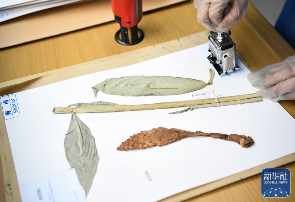 ↑在华南国家植物园标本馆,工作人员对植物标本进行编号整理(7月4日摄)。