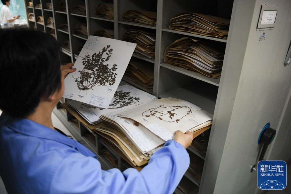 ↑在华南国家植物园标本馆,工作人员整理植物标本(7月4日摄)。