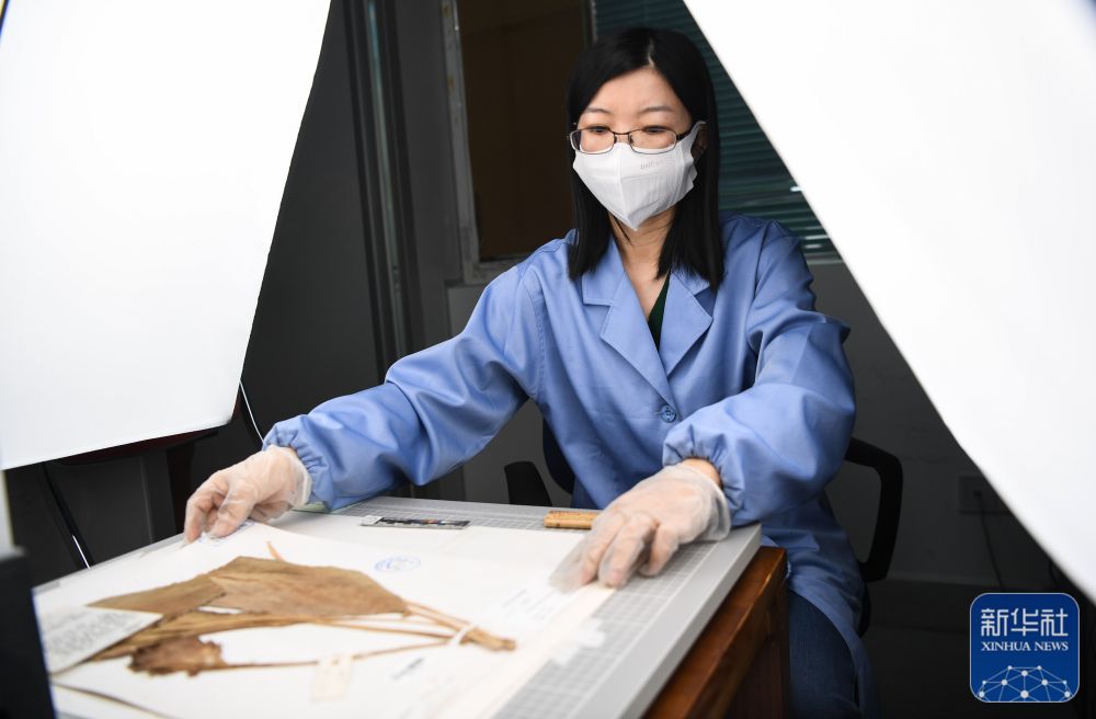 ↑在华南国家植物园标本馆,工作人员给植物标本拍照存档(7月4日摄)。