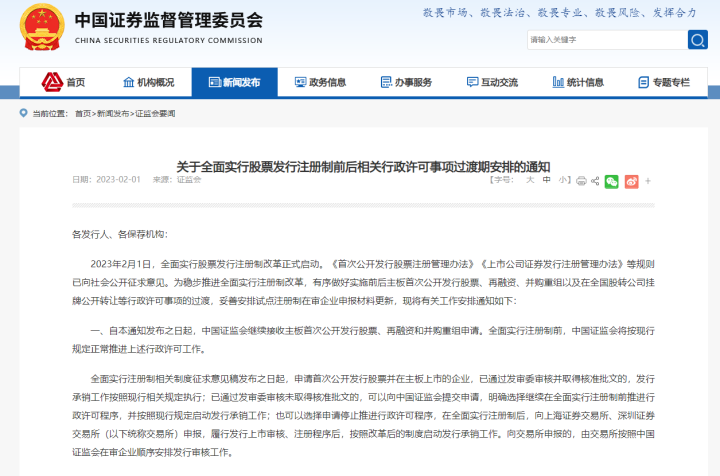 2023年2月1日,全面实行股票发行注册制改革正式启动。《首次公开发行股票注册管理办法》《上市公司证券发行注册管理办法》等规则已向社会公开征求意见。为稳步推进全面实行注册制改革,有序做好实施前后主板首次公开发行股票、再融资、并购重组以及在全国股转公司挂牌公开转让等行政许可事项的过渡,妥善安排试点注册制在审企业申报材料更新,现将有关工作安排通知如下: