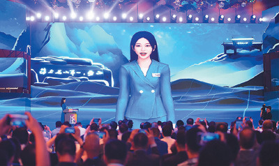 在山东省青岛市崂山区举办的2023国际虚拟现实创新大会开幕式上,现实和虚拟主持人的双向互动成为会场亮点。王海滨摄(人民图片)