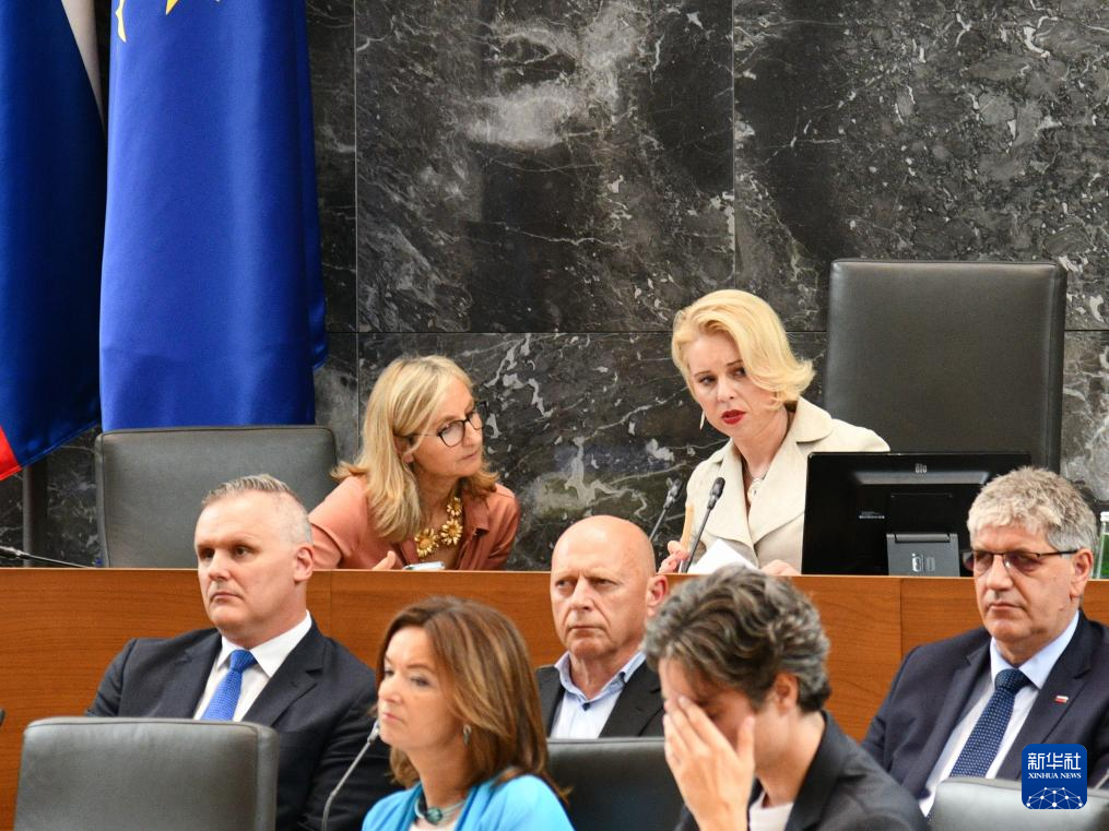 6月4日,斯洛文尼亚国民议会议长祖潘契奇(后右)在卢布尔雅那出席国民议会会议。新华社/斯通社