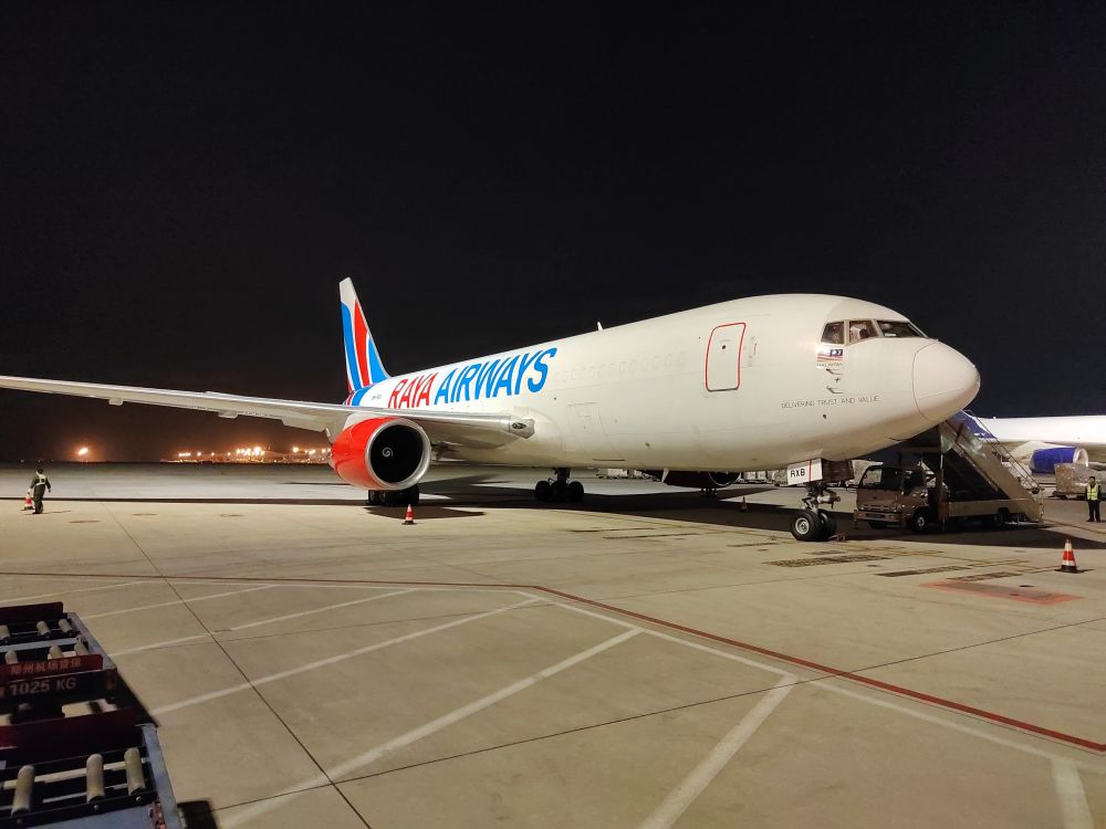 9月25日凌晨,马来西亚瑞亚航空的一架全货机抵达郑州新郑国际机场。(郑州新郑国际机场供图)