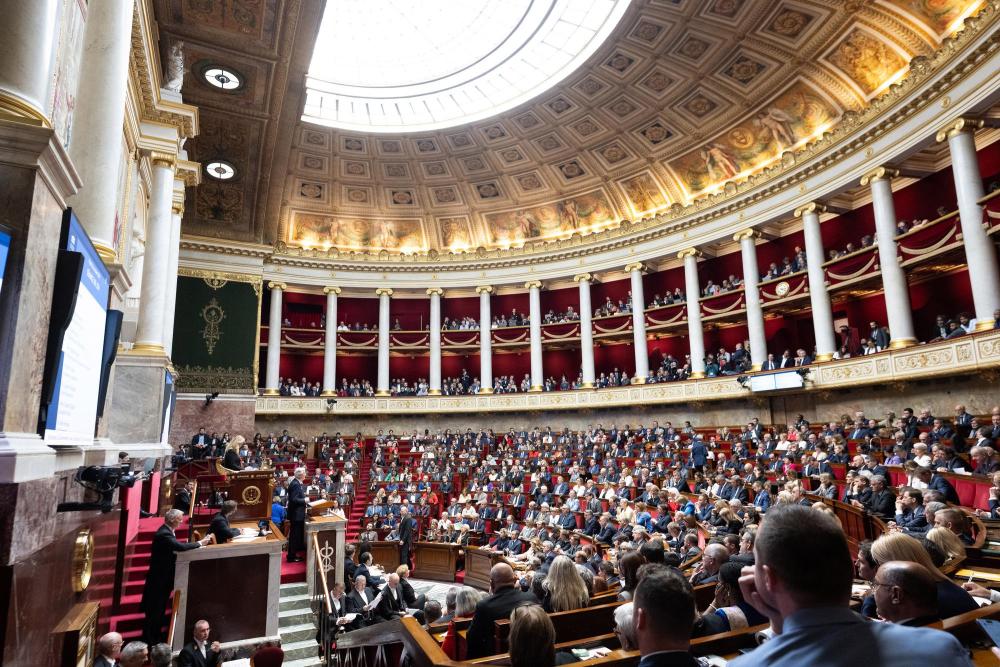 10月1日,法国总理巴尼耶在位于巴黎的法国国民议会发表演讲。新华社发(杰克·陈摄)