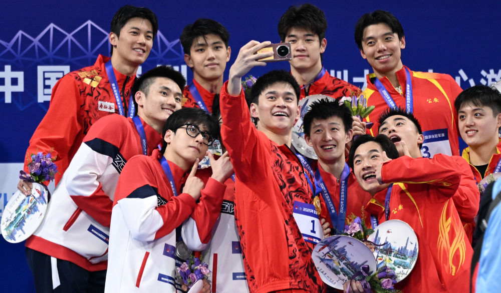 当汪顺、孙杨、潘展乐三代奥运冠军与费立纬为浙江队赢得男子4X200米自由泳接力冠军,特别是当孙杨和潘展乐第三、四棒交接的那一瞬间,全场欢呼如潮,宛如奏响“泳池欢乐颂”。