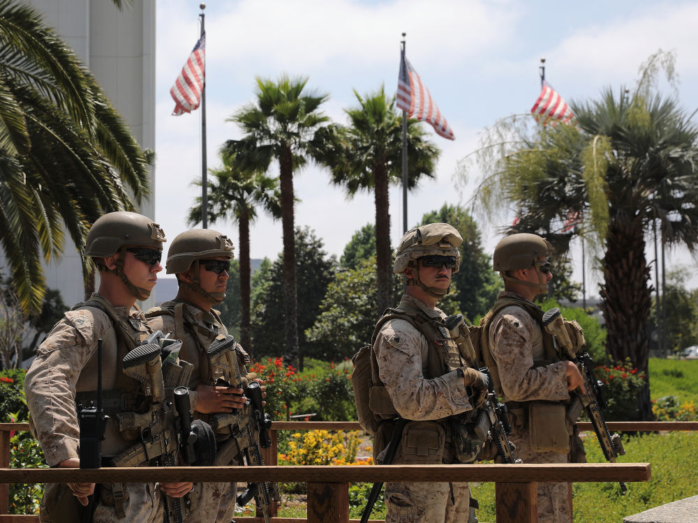 6月上旬,搜捕非法移民的美国联邦机构人员多次在洛杉矶地区与民众发生冲突。在纽森没有请求支援的情况下,特朗普先后多次下令派遣总共约4000名加州国民警卫队员以及约700名美国海军陆战队士兵前往洛杉矶地区协助联邦机构执行任务。虽然这些人员大多数在7月之后撤出,但目前洛杉矶仍有约300名国民警卫队员留驻。
