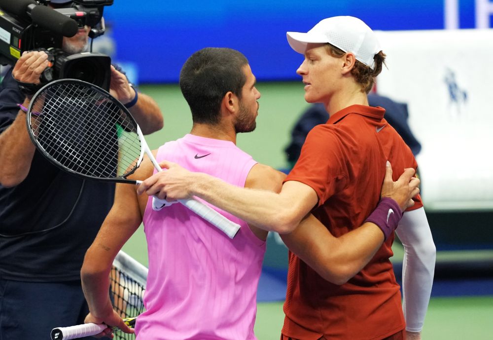 9月7日,阿尔卡拉斯(左)和辛纳在比赛后拥抱致意。新华社记者 吴晓凌 摄