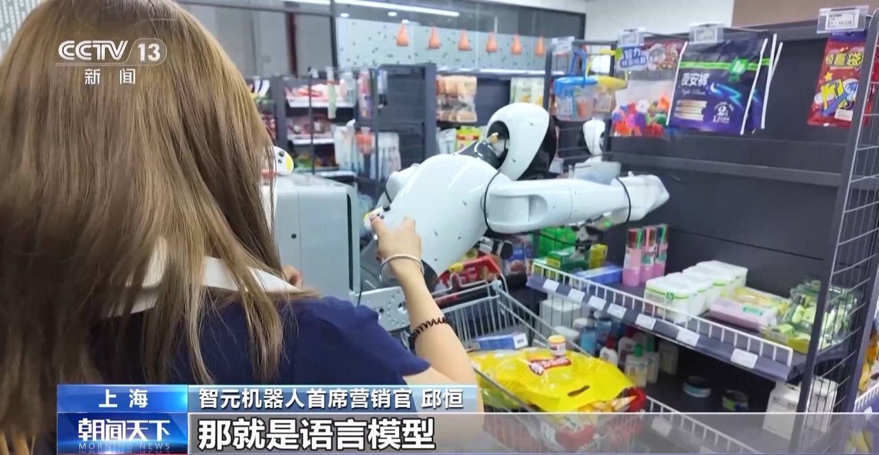 智元机器人首席营销官 邱恒:这里面涉及三个智能,作业智能、交互智能和运动智能。比如把桌子上的一个蓝颜色的瓶子拿起来,这里面首先是要听懂,就是语言模型,然后看见蓝色的瓶子就是视觉模型,最后行动把它抓起来,就是行动模型,把这三个真正融为一体。
