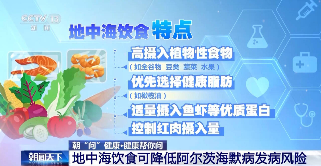 首都医科大学宣武医院主任医师 唐毅:地中海饮食主要是通过减轻大脑的炎症、减轻氧化应激对神经的损伤、保护神经的细胞膜以及减少脑血管的损害来发挥作用的。同时也要注意,我们所有的饮食都要均衡,糖尿病、高血脂等患者在选择食材的时候,应该根据医生的建议适当调整饮食比例。