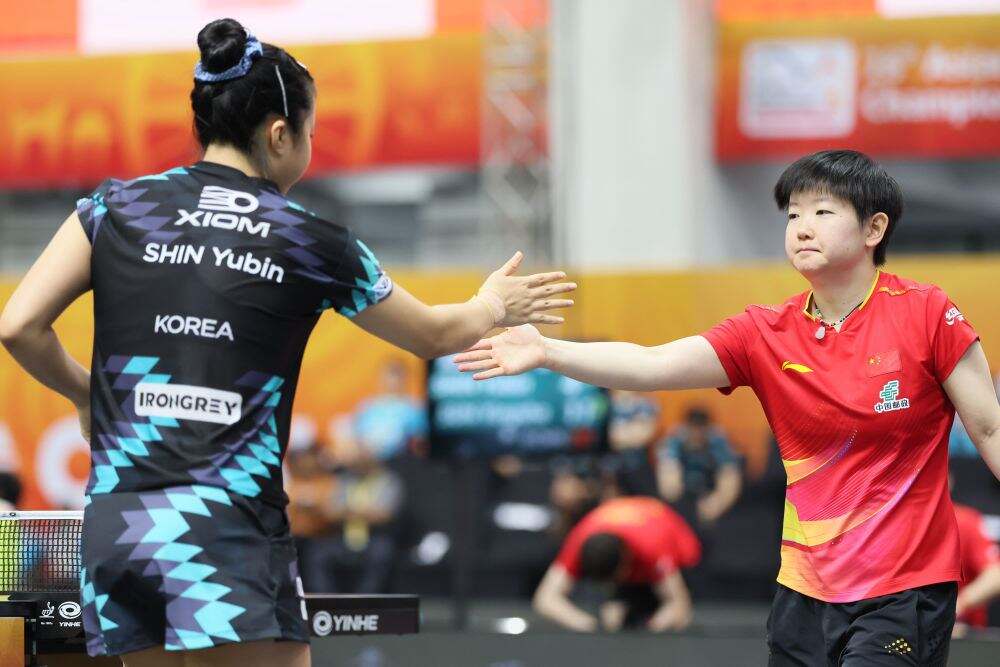 当日上午的女团半决赛中,国乒派出孙颖莎在首盘出战韩国队的申裕斌,开局后场地内不时出现水渍,工作人员反复进场擦拭,对比赛造成了一些影响,但孙颖莎保持专注,以11:4、11:8连胜两局。申裕斌在第三局以11:4扳回一城,但第四局孙颖莎打出11:4,为中国队取得“开门红”。