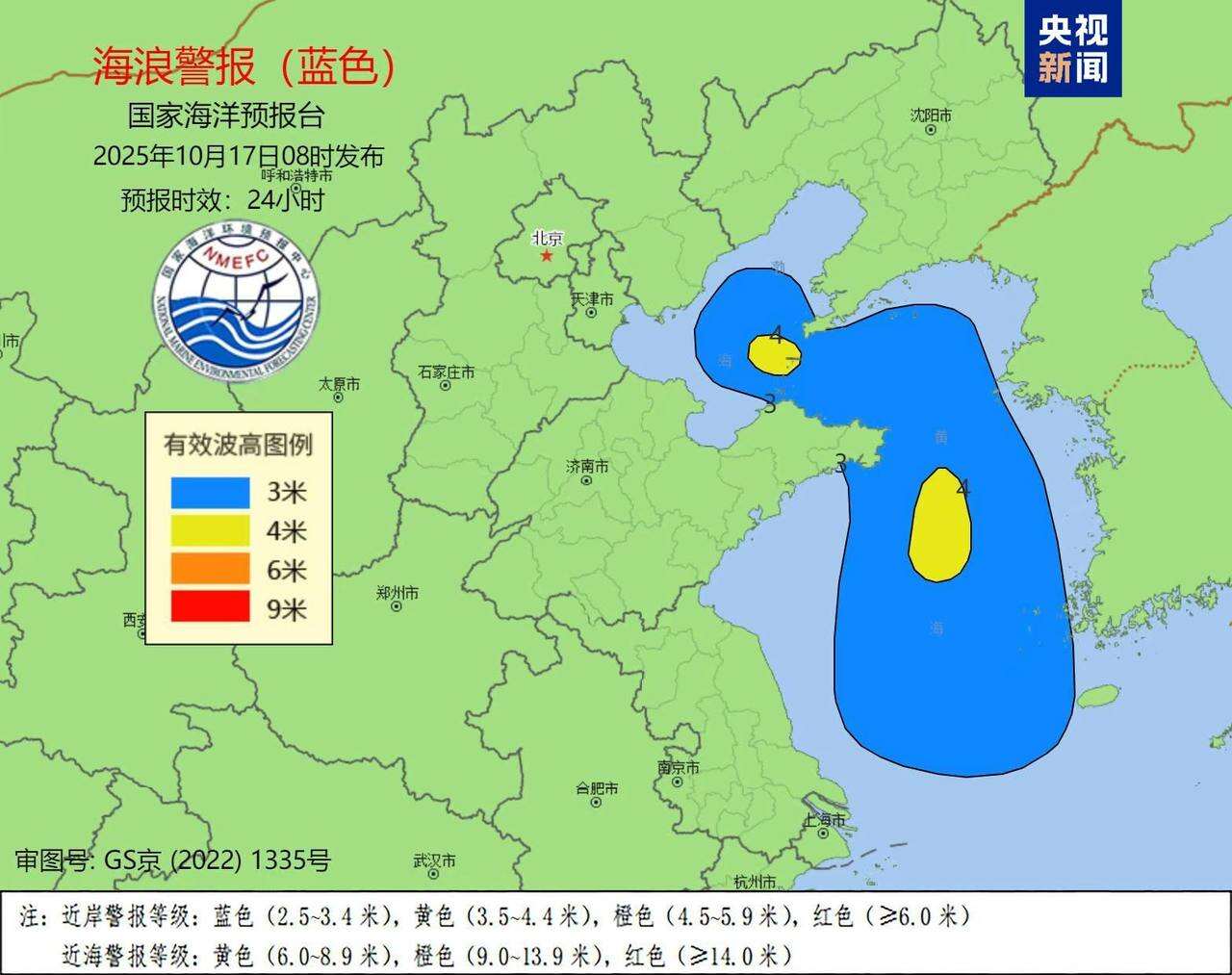 海浪方面,受强冷空气的影响,预计10月17日夜间到18日上午,渤海、黄海将出现2.5到4.0米的大浪到巨浪区;辽宁西部、河北、山东北部、东部、江苏北部近岸海域将出现2到3.3米的中浪到大浪,近岸海域海浪预警级别为蓝色。