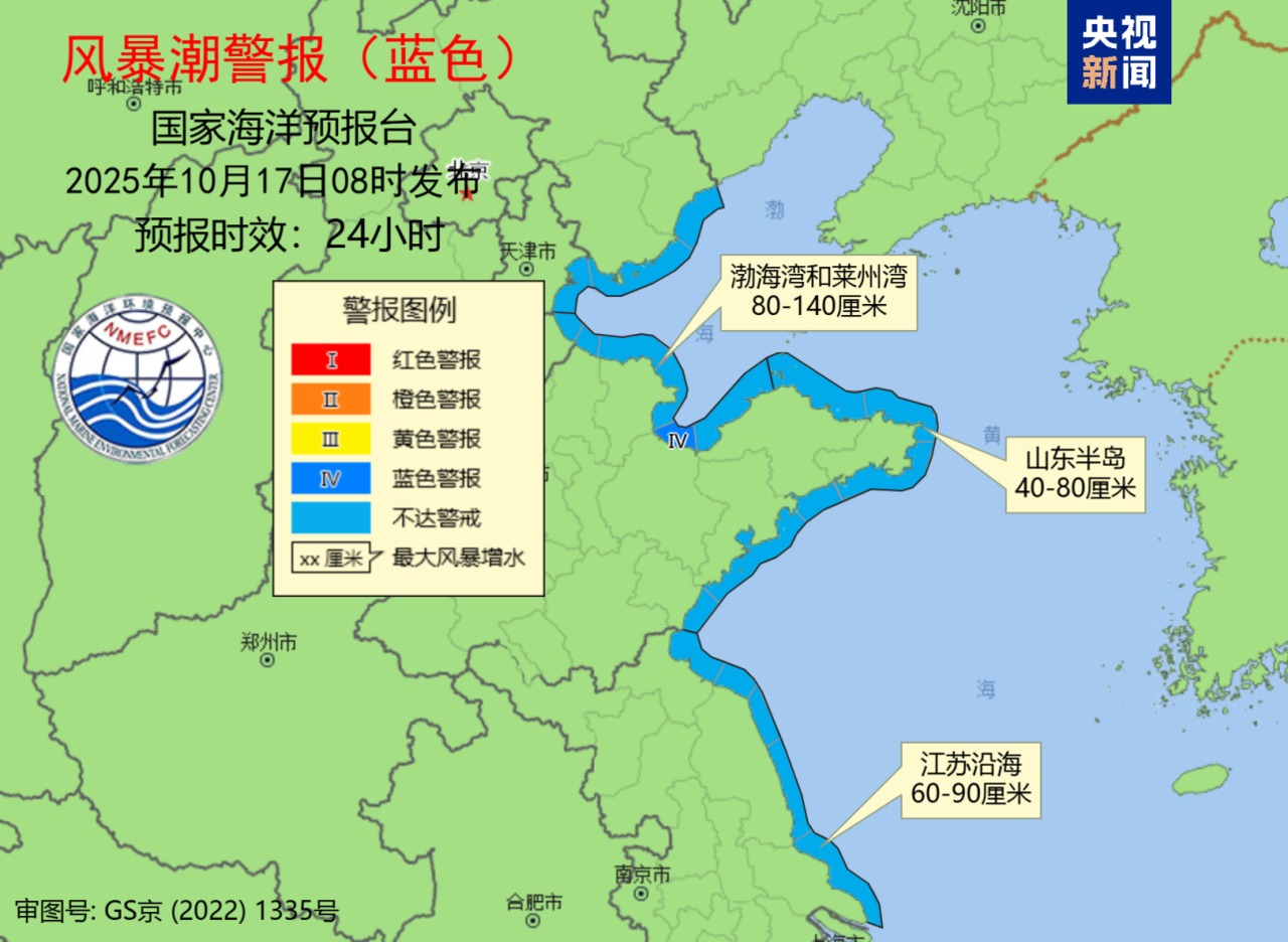 风暴潮方面,预计10月17日傍晚至18日上午,渤海湾和莱州湾将出现80到140厘米的风暴增水,山东半岛沿海将出现40到80厘米的风暴增水,江苏沿海将出现60到90厘米的风暴增水。山东省潍坊市的风暴潮预警级别为蓝色。