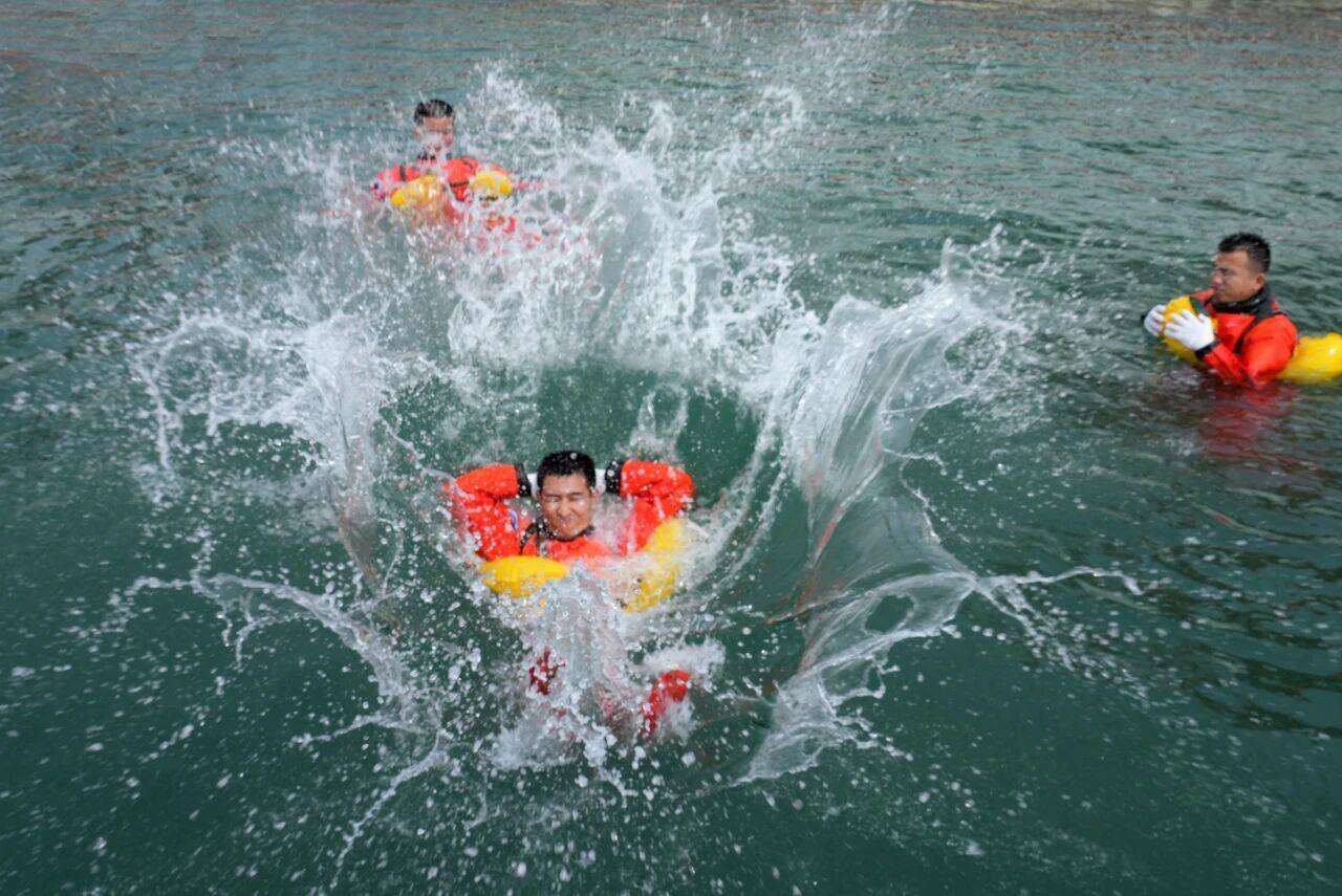 △航天员张陆(左)和张洪章(右)在进行水下出舱活动训练