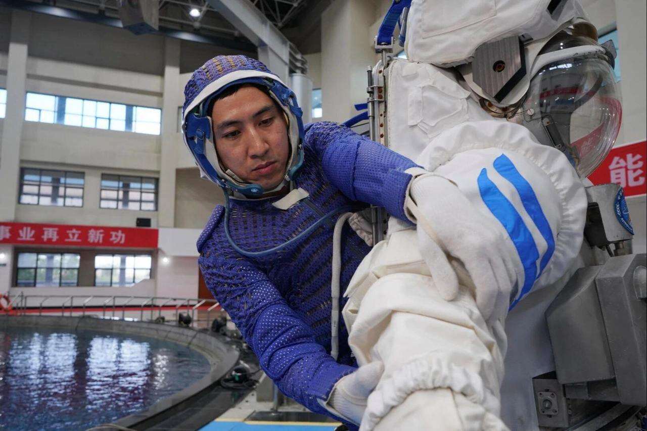 △航天员张陆水下出舱活动训练前进入水下训练服