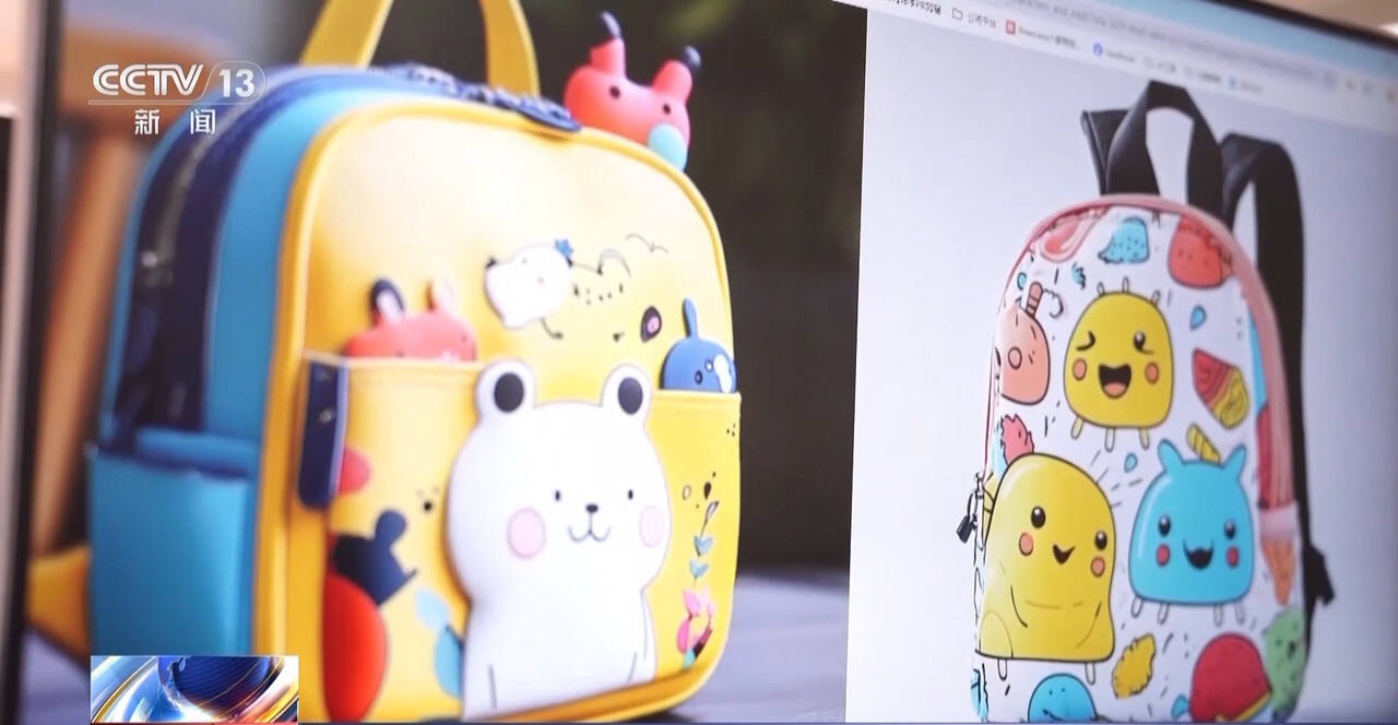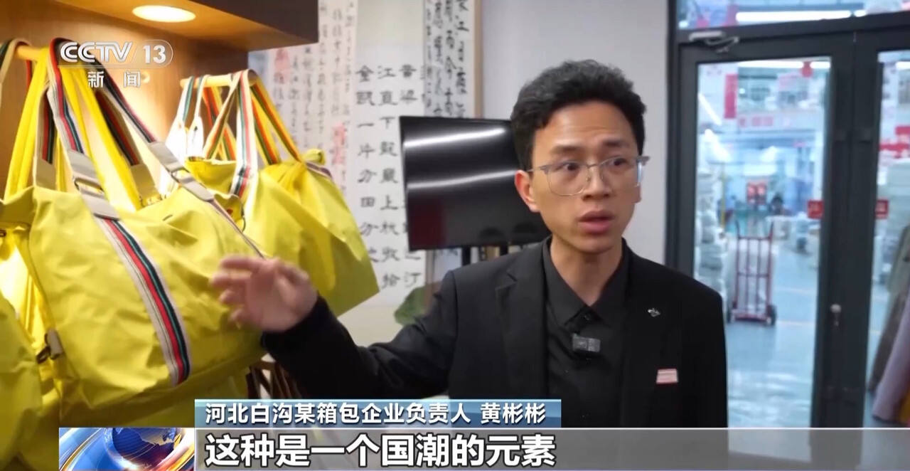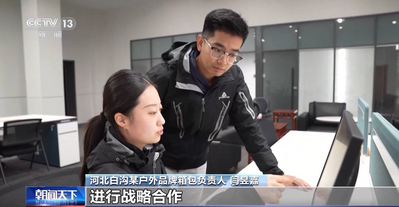 河北白沟某户外品牌箱包负责人 闫昱嘉:我们会跟各大院校顶尖的设计团队进行战略合作,比如说我们跟中央美术学院合作了AI设计服务,以及跟江南大学设计学院合作了一些新面料的研发。