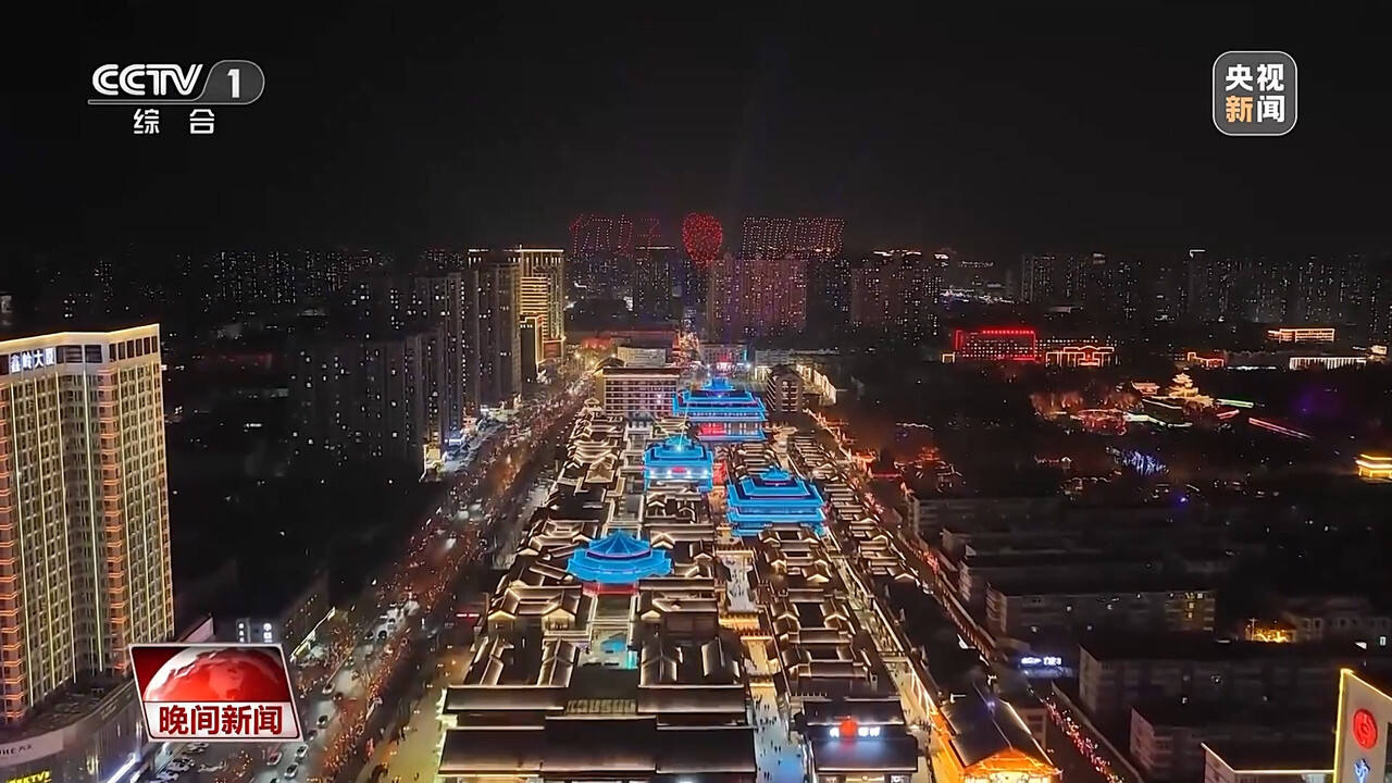 在河北邯郸,全长1.8公里的邯郸道历史文化街区灯火璀璨,古风灯笼错落摇曳,特色成语灯帘相映成趣,浓郁的节日喜庆氛围扑面而来。夜幕降临,数百架无人机腾空而起,以夜空为画布,精准勾勒出和氏璧、邯郸古建轮廓等城市标志性符号,光影交织间,游客们沉浸其中,感受到节日的热闹与文化的厚重。
