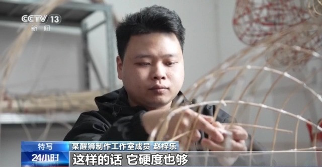 某醒狮制作工作室成员 赵梓乐:我们一般是挑那种细一点、够硬的竹子去扎狮头,这样的话它硬度够,重量也能达到我们预想效果。因为有狮子是跳梅花桩,让狮子跳跃更轻松。